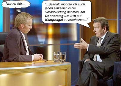 Was für eine kreative, vielseitige Geschichte! Herr Kerry kann sich doch glücklich schätzen, sie fortsetzen zu dürfen. Sollte man meinen! Stattdessen reagiert Herr Kerry jedoch -wie die meisten Sechstklässler auch- mit Unwillen, sich an die Vorgaben zu halten. Zitat Kerry: "Bush went to war the wrong way - I voted for the right way". Übersetzung: "Der Anfang ist doof!". Da er Godzilla nicht auftreten lassen kann, wird sein Ende dann wohl dann entsprechend lieblos. Beispiel: "Lynndie setzte Saeed vor einem Haus ab. Auf dem Haus stand eine Tafel mit dem Wort 'UN'. 'Die kümmern sich um alles!', rief Lynndie. Sam und Lyndie fuhren weg. Dann schliefen sie, dann frühstückten sie. ENDE" Wollen wir also hoffen, dass Herr Bush seine wundersame Geschichte im November selber weiterschreibt und Kerry nicht ans Ruder beziehungsweise den Griffel kommt.